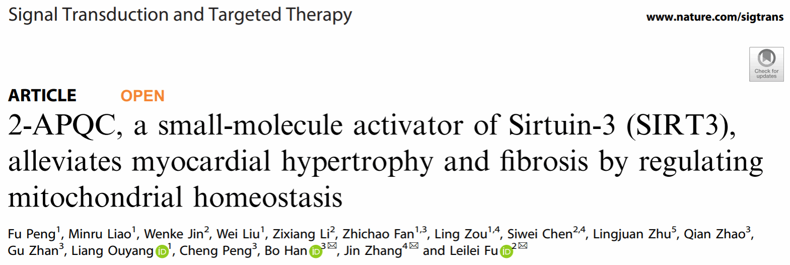 近日,365英国上市公司官网符雷蕾课题组联合四川大学药学院彭芙课题组与深圳大学药学院张瑾课题组及成都中医药大学药学院的合作者们在Signal Transduction and Targeted Therapy (中科院一区Top期刊,影响因子:39.3) 上共同发表了题目为“2-APQC, a small-molecule activator of Sirtuin-3 (SIRT3), alleviates myocardial hypertrophy and fibrosis by regulating mitochondrial homeostasis”的研究性论文,论文的最后通讯作者为365英国上市公司官网的符雷蕾副教授。