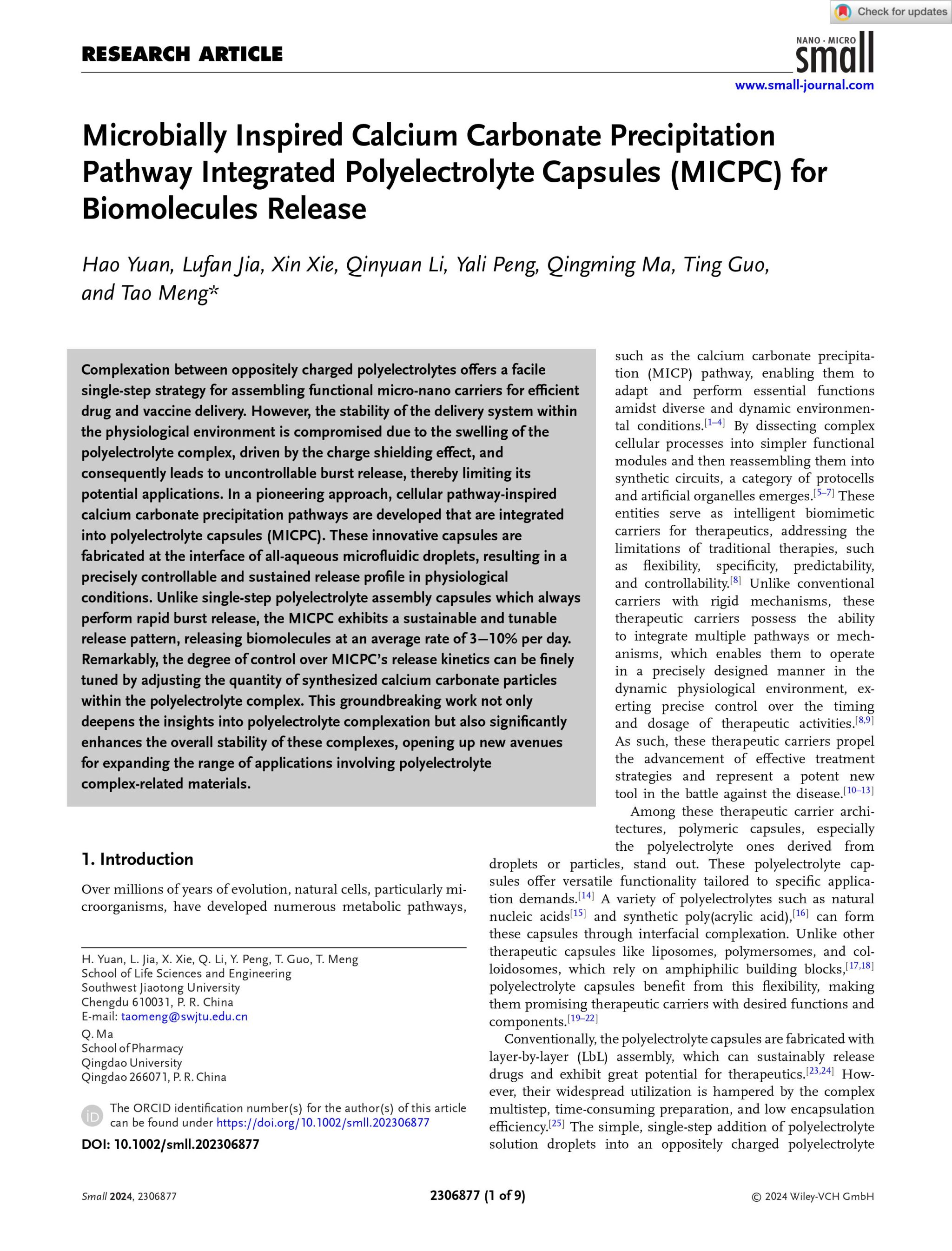 近日,国际微纳生物领域权威期刊《Small》(影响因子13.3)报道了我校“微纳生物技术”创新团队孟涛教授的研究成果“Microbially Inspired Calcium Carbonate Precipitation Pathway Integrated Polyelectrolyte Capsules (MICPC) for Biomolecules Release”中文译名:“受微生物启发的整合碳酸钙颗粒合成通路的聚电解质微囊(MICPC)用于缓释生物分子”(DOI: 10.1002/smll.202306877)。论文第一作者为365英国上市公司官网苑昊讲师,通讯作者为孟涛教授,365英国上市公司官网为第一署名单位。
