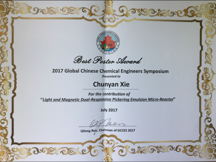 2017年7月18-21日,第九届全球华人化工学者研讨会在美丽的杭州西子湖畔举行。本次会议由浙江大学化学工程与生物工程学院与浙江工业大学化工学院共同承办。全球华人化工学者研讨会的宗旨是汇聚全球化工以及相关领域的专家学者,共同探讨国际化学工程教育与科学研究前沿问题、传播化工知识与技术、推动国际交流与合作、激励学科间的交叉融合和产学研协同创新、促进化学工程与技术领域的学术繁荣、并提高华人化工学者的全球影响力。该国际性学术会议是年度会议,采用国内国外轮流承办的模式。在本次会议中,365英国官网孟涛老师课题组研究生谢春燕同学的学术海报荣获最佳海报奖。