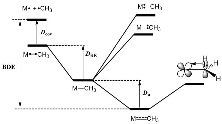 化学键是化学学科最基础的研究内容之一。单重和多重过渡金属−碳键一直是理论化学、有机金属化学和配位化学的研究重点和热点。经过几十年的发展,人们对过渡金属参与的成键模式已有深刻理解。而对过渡金属烷基配合物中C−H轨道与金属空d轨道形成的π反馈键 (πCH→dM)认识不足。基于此,借助自主发展的块定域波函数方法(Block Localized Wavefunction, BLW),该研究工作从理论上证实了过渡金属烷基配合物中πCH→dM反馈键的存在及其在构型扭曲中的决定性作用。随后,基于价键自洽场方法的能量分解手段,研究指出过渡金属烷基配合物中的金属-碳键应该被定义为包含σ和πCH→dM的双键作用。这种双键模型具有较强的普适性,广泛存在于第3族到第9族过度金属参与的烷基配合物中。
