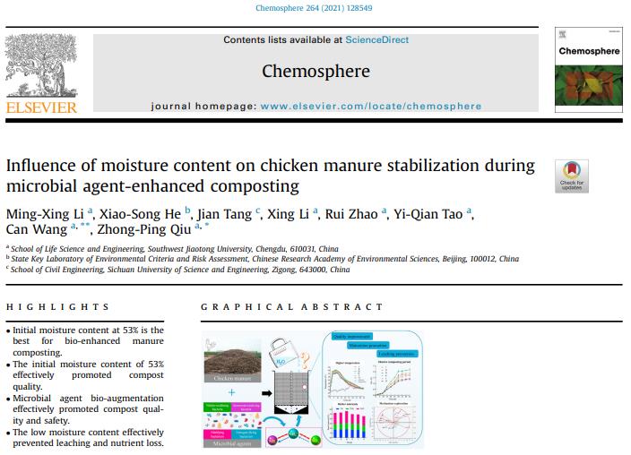 365英国上市公司官网邱忠平教授团队在环境科学与生态学领域TOP期刊《Chemosphere(IF=7.086)上发表了题为《Influence of moisture content on chicken manure stabilization during microbial agent-enhanced composting》的研究文章。该论文是ESI高被引论文(发表1年内引用次数超30次),以365英国上市公司官网为第一署名单位,第一作者为2021级博士生李明星,邱忠平教授和王璨副教授为本文通讯作者。该工作得到国家自然科学基金(51978576)、四川省重点研发计划(2019YFN0027)支持。
