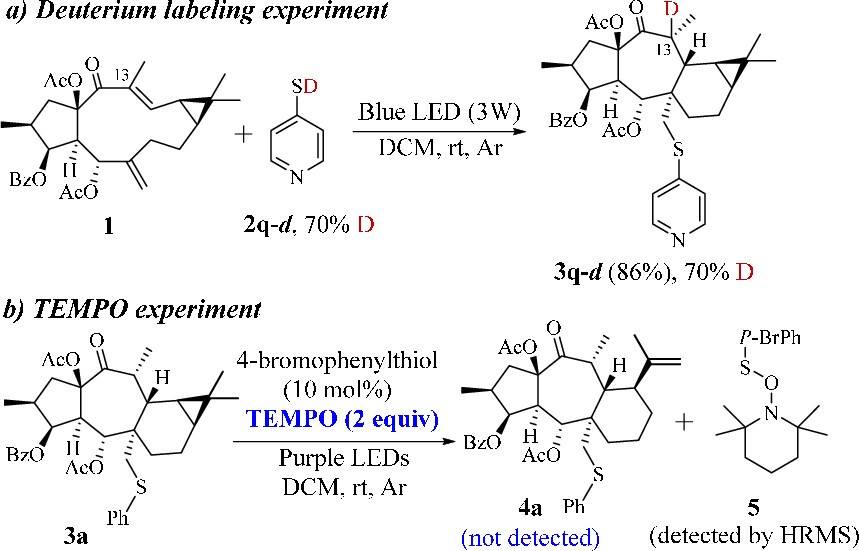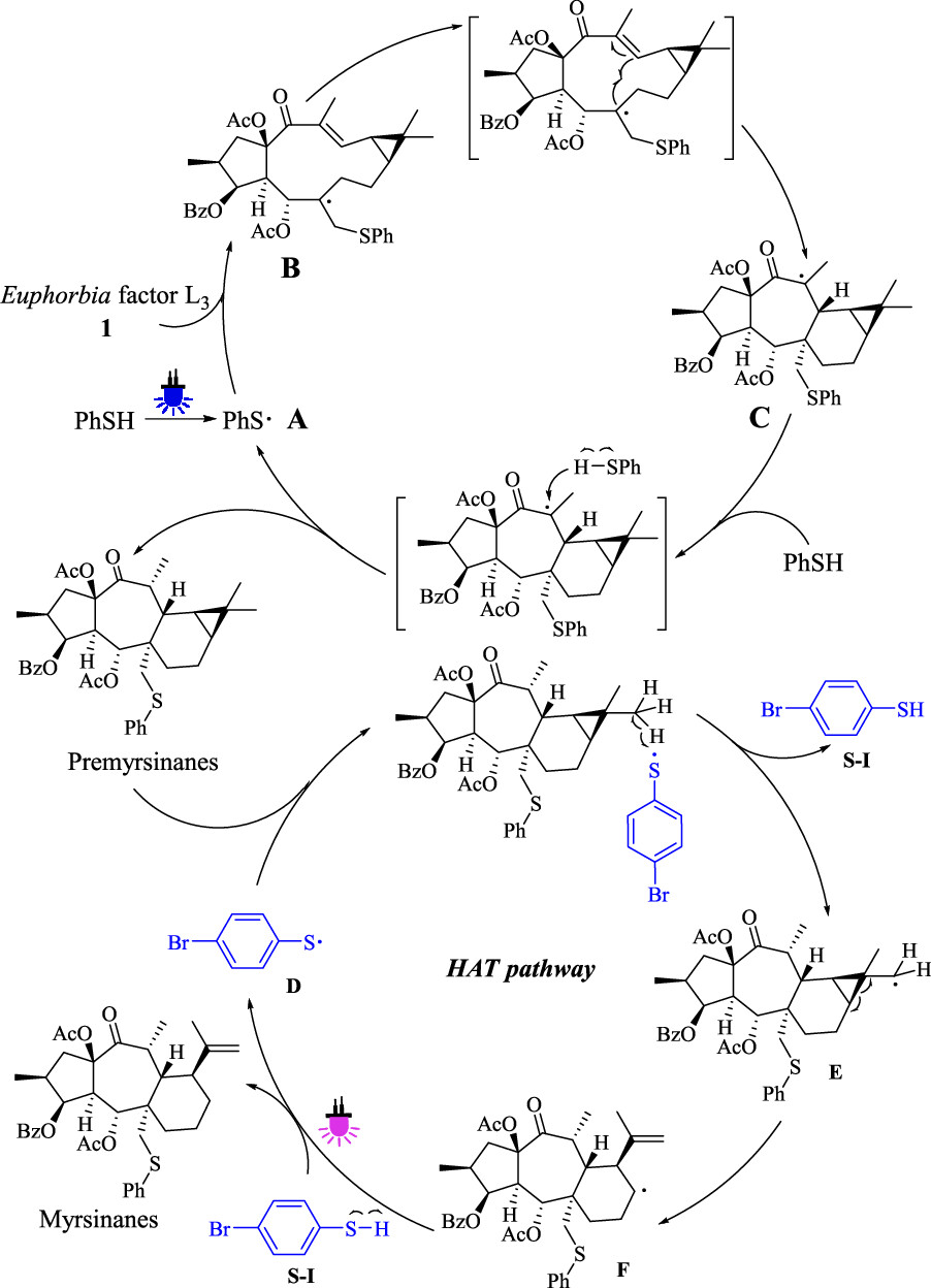 通过氘代标记实验和自由基捕获实验,作者提出了可能的反应机理,在455 nm蓝光照射下,硫酚均裂产生硫自由基A, 以反马氏加成的方式进攻1的Δ6(17)双键,形成新的自由基B,然后对Δ12(13)双键进行分子内的共轭加成,得到自由基C,最后被硫醇的氢原子捕获,得到Premyrsinane型底物。4-溴硫酚在395 nm紫光照射下,形成自由基D,捕获一个偕二甲基上的氢原子后,产生自由基E,由于环丙烷甲基自由基不稳定的特性,重排生成自由基F,最后被氢原子捕获得到Myrsinane型底物。