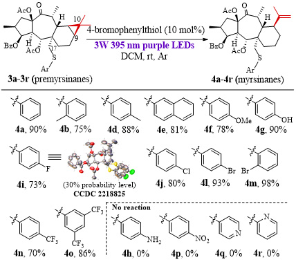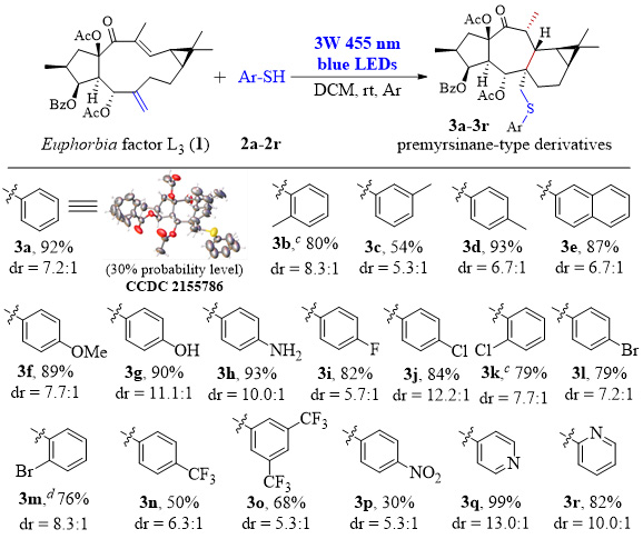 作者利用天然来源丰富的大戟因子L3(Lathyanes型二萜)1为起始原料,通过仔细剖析其结构,尝试用硫醇作为自由基引发剂,在可见光的促进下与Δ6(17)双键发生thiol-ene点击反应,经迈克尔受体Δ12(13)双键捕获自由基中间体,从而实现跨环环合得到Premyrsinane型骨架。确定最优反应条件后,作者对硫醇的范围进行了考察,发现一系列吸电子和供电子取代的芳香硫醇,以及吡啶硫醇均能以良好的收率和优秀的立体选择性得到硫取代的Premyrsinane型骨架,其立体结构用3a的X-Ray单晶证实,与自然界Premyrsinane型二萜的构型一致。