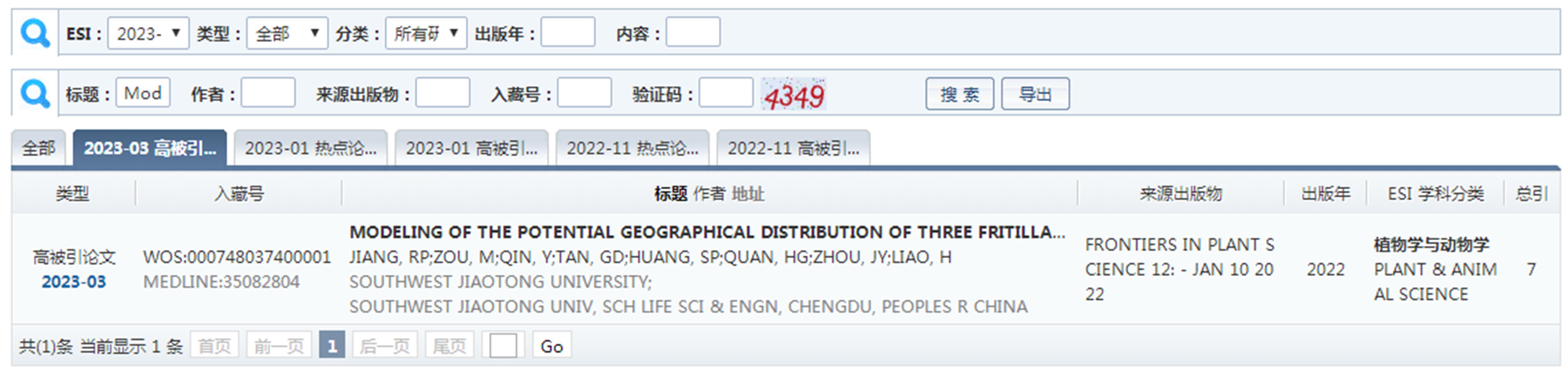 近日,根据最新Web of Science ESI最新公布的数据显示,365英国上市公司官网周嘉裕、廖海副教授在植物学国际期刊《Frontiers in Plant Science》上发表题为“Modeling of the Potential Geographical Distribution of Three Fritillaria Species Under Climate Change”的研究型文章成功入选ESI高被引论文。《Frontiers in Plant Science》是植物学领域内最具影响力和权威的期刊之一,该刊目前为JCR分区和中科院分区双一区TOP期刊。