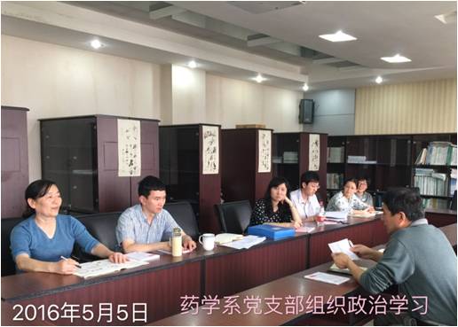 5月5日下午,药学系教工党支部开展了“两学一做”的专题学习,药学系教师党员和部分教师参加了专题学习。支部书记胡久梅老师重点讲解了“两学一做”的主要精神:学党章学党规,修炼党性,牢记宗旨,坚持真理,守纪律,讲规矩,做奉献;学习习近平主席的系列讲话,跟进中央的精神,努力实现中国梦;做一名有理想、有信念、敢担当的合格共产党员。会上分发了相关学习文选,要求全体教师党员认真学习,坚定理想信念,提高自身素质和能力,为学院建设和学科发展作贡献。