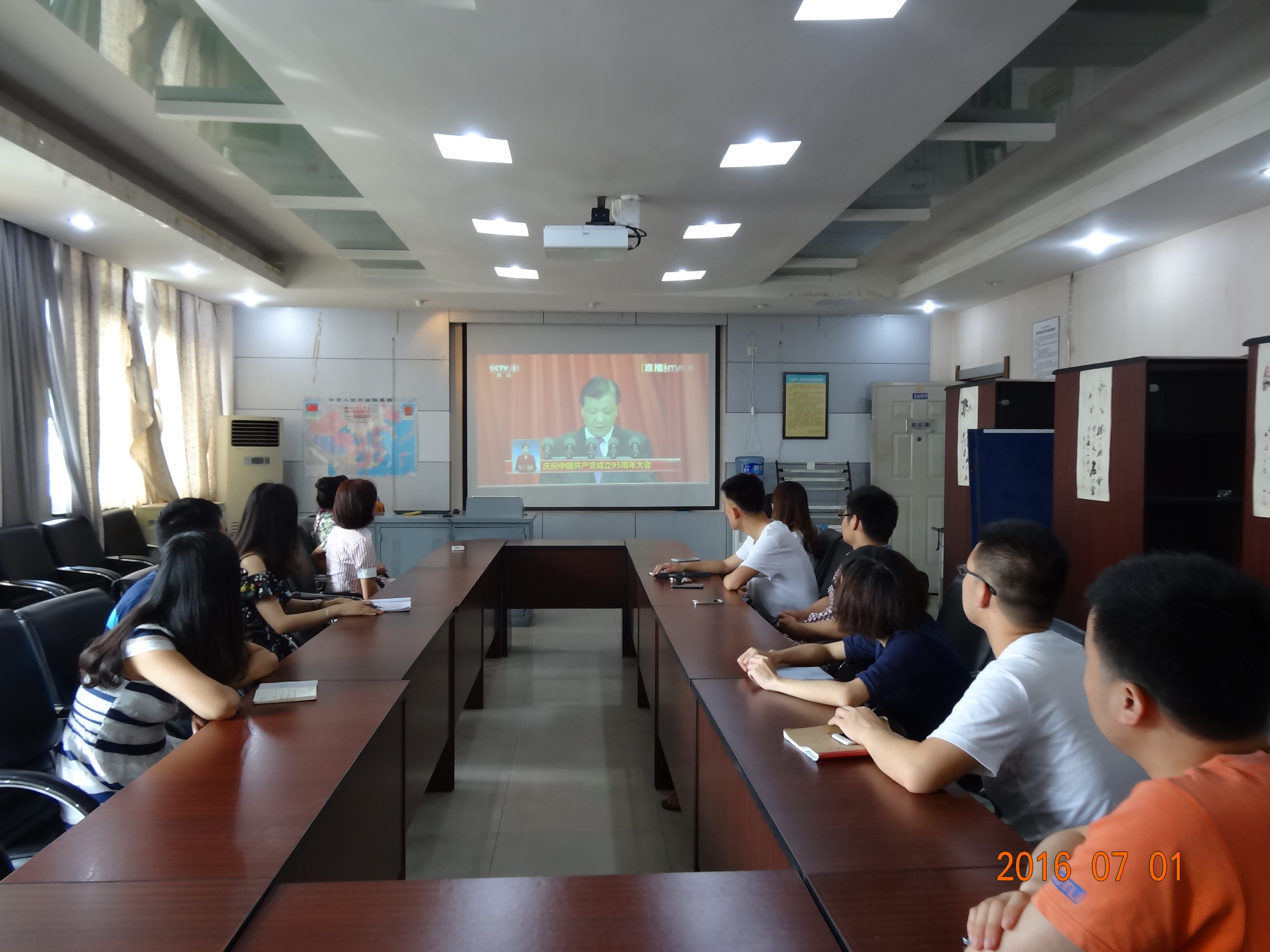 为迎接建党95周年,按校党委统一部署,7月1日上午,365英国上市公司官网党委组织学院党员干部、师生代表在3609集体观看了中国共产党成立95周年大会现场直播视频。学院党委书记李卓慧、党委委员贺妍、办公室主任陈琳、研究生党支部书记吴润、李祯、本科生党支部书记黄国强,以及师生代表20余人观看了视频。与此同时,学院师生党员还通过网络形式,在办公室、实验室、宿舍等地收听收看了直播。