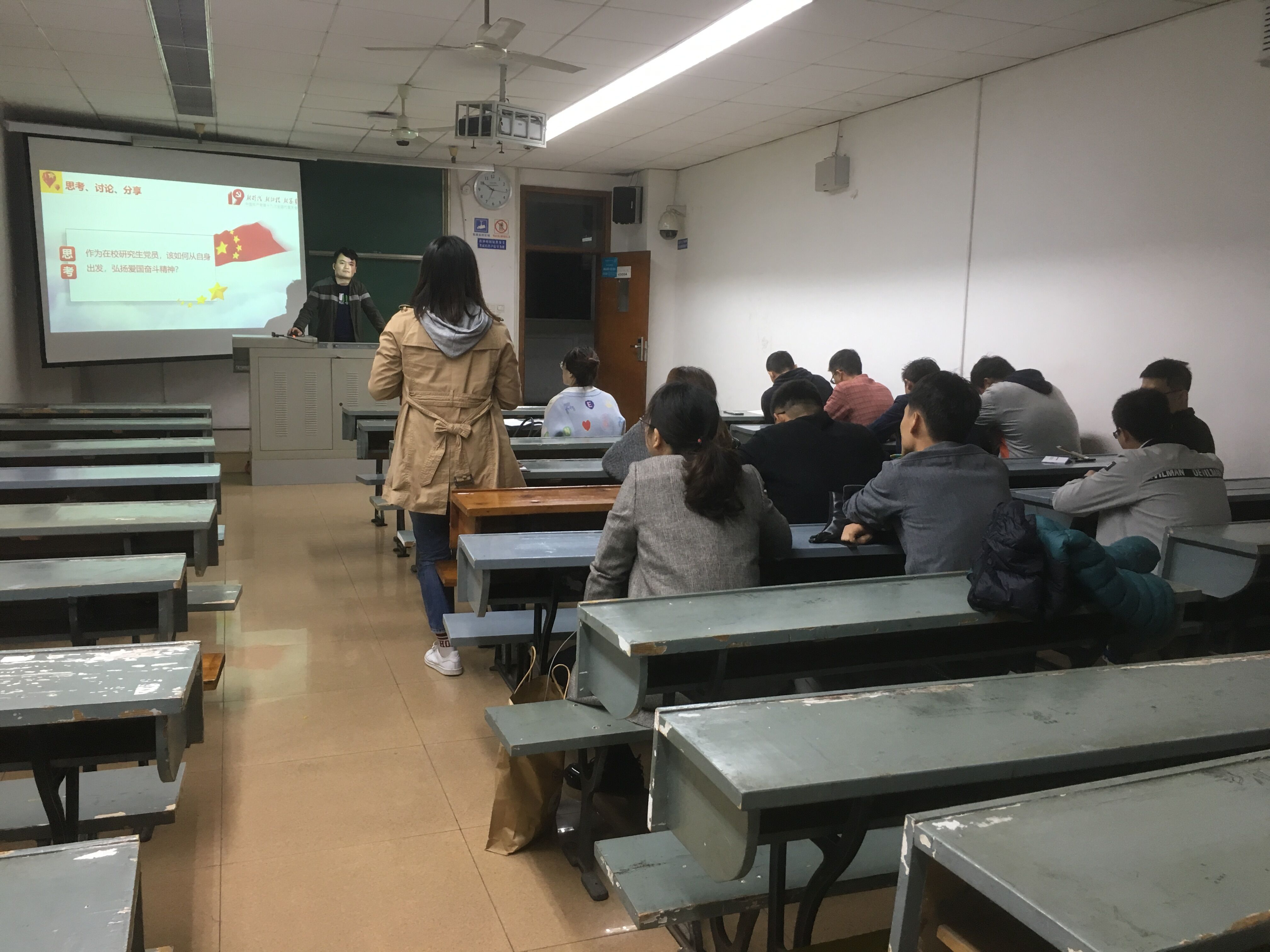 2016级硕士党支部于10月18日晚在4305A教室召开“弘爱国奋斗精神,扬硕士党员风采”主题党日活动。活动由支部书记韦乐华主持,支部全体党员参加了学习,支部指导教师、学院专职组织员华晶晶也出席了本次活动。