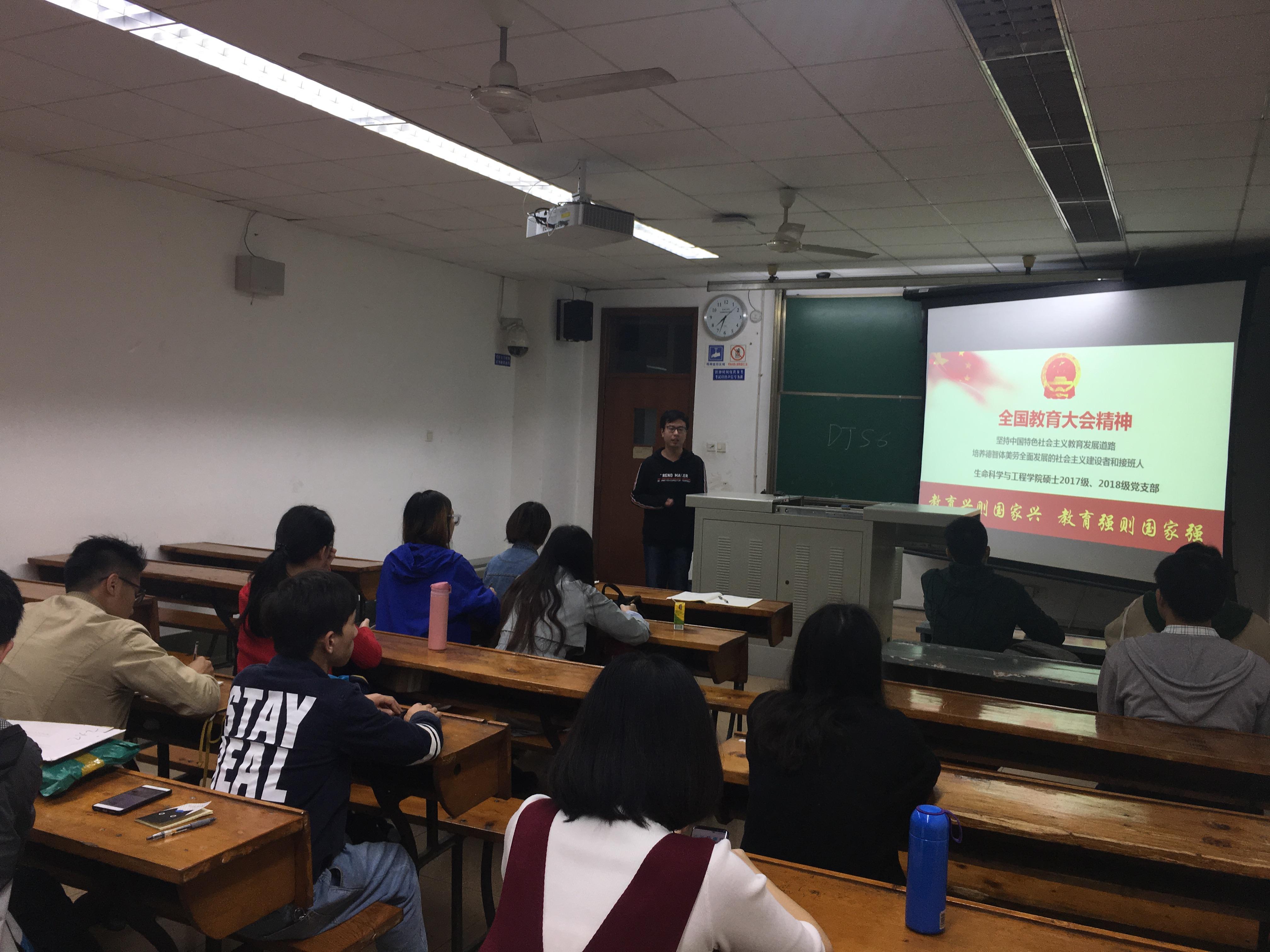 为学习贯彻全国教育大会精神,学院2017级、2018级硕士研究生党支部于11月1日晚在逸夫馆4304B教室联合开展了以“学习教育大会精神,为学校建设凝心聚力”为主题的党日活动。活动由2017级研究生党支部书记孙源同志主持,2018级党支部书记王珏同志主讲,两个支部的党员参加了活动。