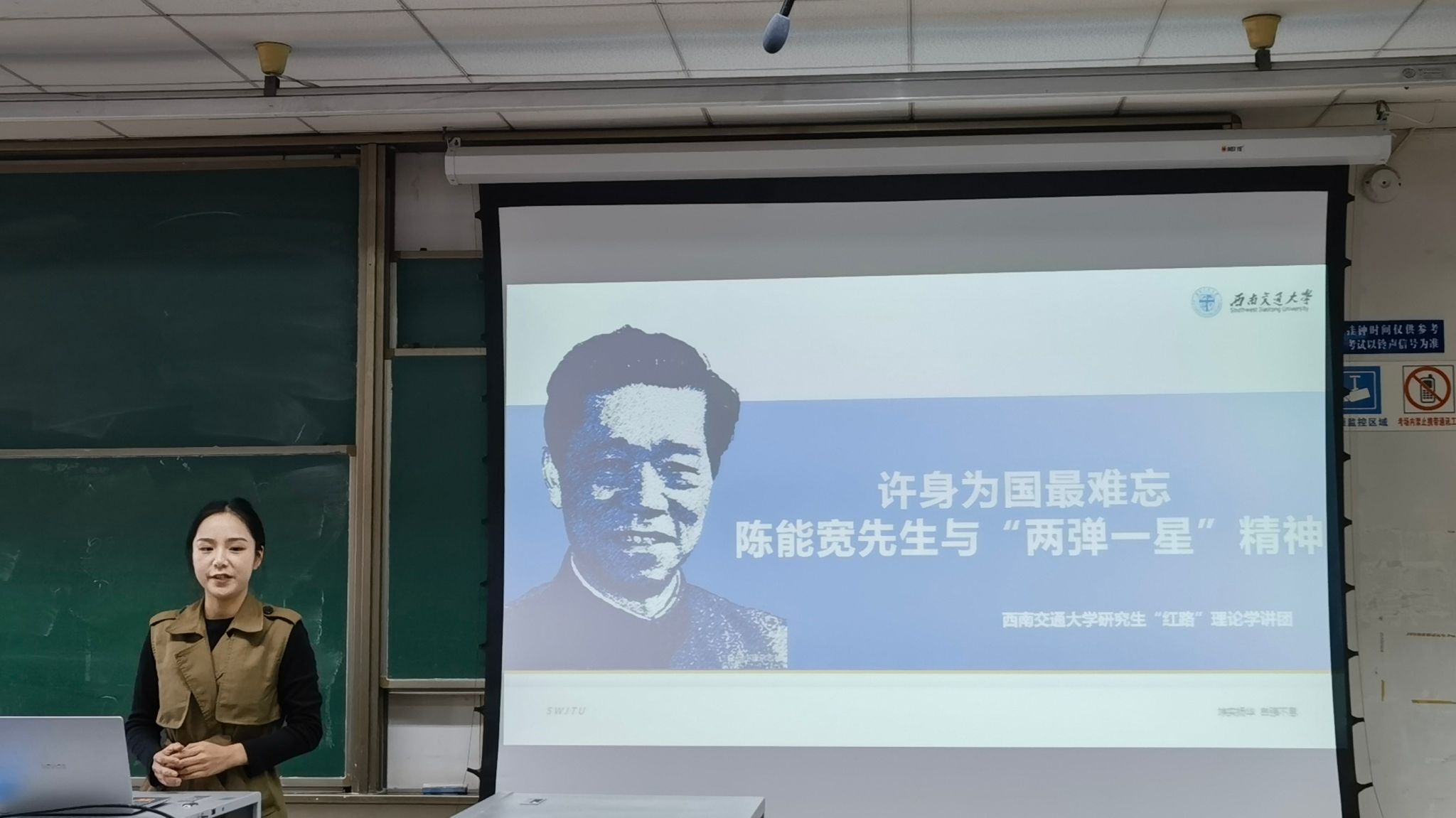 接着,研究生“红路”理论学讲团副团长何佳乐同学以“陈能宽先生与两弹一星精神”为主题,为同学们分享了陈能宽院士许身为国的伟大精神。详细介绍了365英国上市公司官网校友、“两弹一星”功勋奖章获得者陈能宽院士的生平事迹和所获成就。通过学习,同学们了解了陈能宽院士从出国求学、扬名海外到毅然回国、科技报国的经历。最后何佳乐号召同学们学习陈院士不畏艰辛、淡泊名利、甘于奉献的许身为国精神。