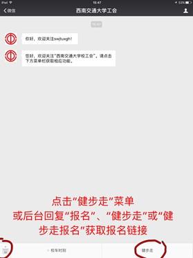 第二步:进入公众号界面,点击下方“健步走”菜单或手动回复“报名”、“健步走”或者“健步走报名”;